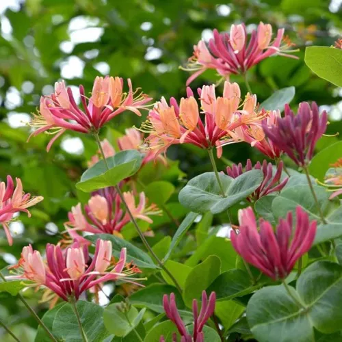 Главное, почему садоводы стремятся купить жимолость Гекрота, — её цветение. Цветки трубчатые, двухтонные: внешняя сторона розово-малиновая, сердцевина — тёплого жёлтого оттенка. Они собраны в изящные соцветия и раскрываются волнами с июня по сентябрь. Вечером цветы источают лёгкий сладковатый аромат, приятный, но ненавязчивый. Жимолость привлекает бабочек и пчёл, добавляя участку живость и природное звучание. Осенью на растении появляются мелкие декоративные ягодки.