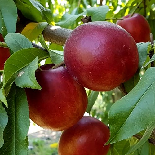 - Шаровидной формы, жёлтого, с карминовым покровом, цвета. Кожица не имеет воскового налёта. Мякоть приятная и сочная, как и сок, жёлтого, с красноватыми прожилками, цвета. Косточка небольшая, легко извлекается;